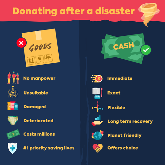 The most urgent need in times of crisis is money, not stuff. No other type of donation can match its impact.